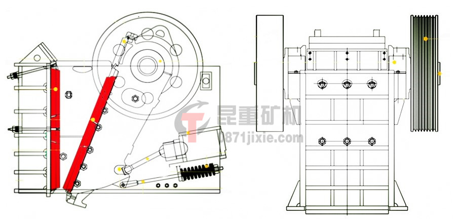 顎式破碎機(jī)的工作方式是由電動機(jī)驅(qū)動皮帶和皮帶輪,通過偏心軸使動顎上下運(yùn)動,當(dāng)動顎上升時(shí)肘板與動顎間夾角變大,從而推動動顎板向固定顎板接近,與其同時(shí)物料被壓碎或劈碎,達(dá)到破碎的目的。當(dāng)動顎下行時(shí),肘板與動顎夾角變小,動顎板在拉桿,彈簧的作用下,離開固定顎板,此時(shí)已破碎物料從破碎腔下口排出。隨著電動機(jī)連續(xù)轉(zhuǎn)動而破碎機(jī)動顎做周期運(yùn)動壓碎和排泄物料,實(shí)現(xiàn)批量生產(chǎn)。