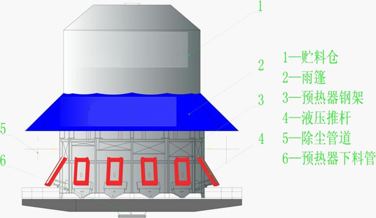 物料由豎式預(yù)熱器頂部料倉經(jīng)下料溜管導(dǎo)入豎式預(yù)熱器本體預(yù)熱室內(nèi),同時(shí)在窯尾引風(fēng)機(jī)所產(chǎn)生的負(fù)壓的作用下將來自回轉(zhuǎn)窯窯尾煅燒所產(chǎn)生的高溫?zé)煔庖筋A(yù)熱器內(nèi)部,1000攝氏度左右的高溫?zé)煔庠诖┻^物料時(shí),與其發(fā)生熱交換,將物料預(yù)熱至800攝氏度以上,再由預(yù)熱器周邊布置的液壓推料裝置依次將預(yù)熱好的物料推出,穿越過料層的高溫?zé)煔獾臒崃看蟛糠直晃锪衔眨懦龅臒煔鉁囟燃s為240攝氏度左右,從而完成整個(gè)熱交換過程;每個(gè)液壓推料裝置均采用單獨(dú)的液壓缸驅(qū)動耐熱鋼推頭進(jìn)行工作,通過PLC控制系統(tǒng)可以調(diào)節(jié)推頭之間的間隔時(shí)間及推頭自身的推料時(shí)間,準(zhǔn)確控制進(jìn)料量。最后經(jīng)下料溜槽和轉(zhuǎn)運(yùn)溜槽進(jìn)入回轉(zhuǎn)窯尾部進(jìn)行煅燒。