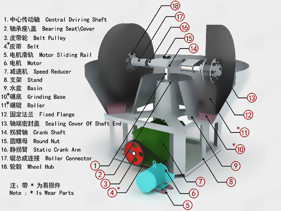 濕碾機采用輪動式磨礦的工作方式:首先電動機將動力傳動至減速機,在減速機帶動下,通過大立軸將力矩傳遞給上方的橫軸,然后經(jīng)安裝在橫軸兩端的拉桿傳遞至碾輪,使碾輪產(chǎn)生驅(qū)動力,沿橫軸水平方向做逆時針旋轉(zhuǎn)運動;工作時的碾輪既能圍繞濕碾機大立軸公轉(zhuǎn),又能圍繞碾輪中心軸進行自轉(zhuǎn),碾盤則固定不動。添加的礦石物料,在碾磨機內(nèi)受到來自碾輪自身重量帶來的擠壓力,碾輪公轉(zhuǎn)自轉(zhuǎn)時與碾盤產(chǎn)生的巨大摩擦力,在受到反復的擠壓、揉搓、研磨后,被徹底粉碎。