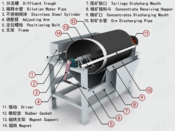 永磁筒式磁選機由磁系、圓筒、分選槽、傳動裝置以及給料、排料各溢流裝置組成。磁系排列和磁極數量對分選結果有決定性影響。根據筒徑大小,磁極一般為4至7極,極性沿周邊方向交替。圓筒用來吸附和運送磁性顆粒并防止礦漿侵入磁系。圓筒及其端蓋用非磁性、高電阻率和耐腐蝕材料制造。分選槽一般用奧氏體不銹鋼制造,用橡膠或合成材料作內襯,以防止磨損。一般用齒輪電機或Y系列電機通過減速機驅動圓筒旋轉。