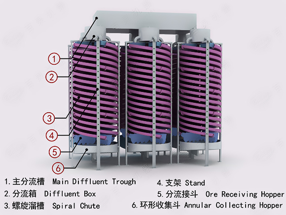 均勻的礦漿通過裝在螺旋溜槽首端的給礦槽緩慢地給到螺旋槽面上,進行分選。螺旋溜槽的尾端裝有閥塊式產品截取槽,將分選的產品沿徑向按品位分成三種。用調節閥塊的位置來改變各產品的截取寬度,產品集聚斗將已截取的多頭礦流分別匯集導出。螺旋溜槽的橫截面,曲線的斜率變化特別適用于細微粒物料的選別。